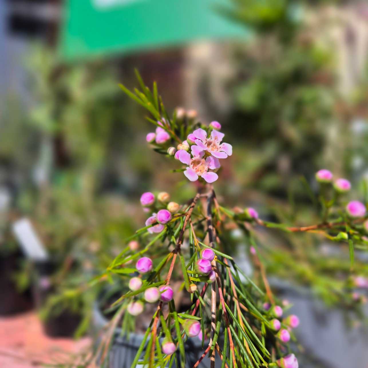 Chamelaucium 'Tumbelina' is a weeping form of wax that can be kept as a low hedge or in a container as a specimen plant. Prune after flowering for shape.