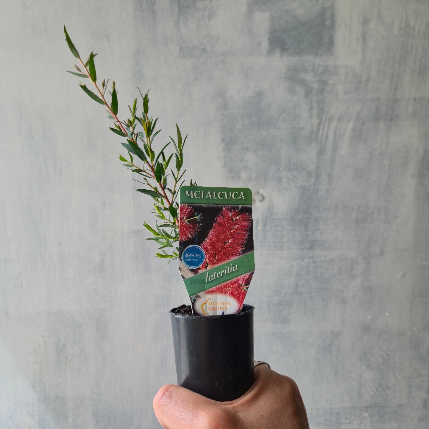 Robin Redbreast Bush (Melaleuca lateritia) is a medium shrub with slender, sometimes arching branches. From spring to autumn, this plant produces striking orange to red bottlebrush flowers.